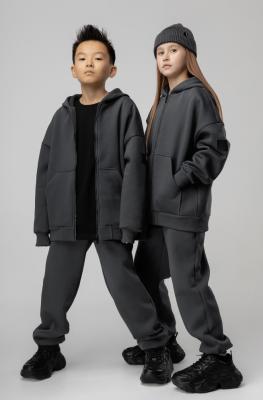Костюм для детей школьного возраста. Толстовка прямого силуэта, с центральной бортовой застёжкой на тесьму молния, на притачном поясе по низу изделия, со спущенным плечом, с втачными рукавами с притачной манжетой, с втачным капюшоном. На полочке располагается карман «кенгуру». . Брюки прямые свободные на притачном поясе с внутренней резинкой, на притачной манжете по низу изделия с внутренней резинкой. Брюки с боковыми карманами.Дополнительно