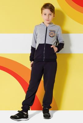 Спортивный костюм для мальчика. Выполнен из хлопкого трикотажа с добавлением небольшого количества лайкры для лучшей износостойкости. Куртка с капюшоном, с застежкой на молнию. Нижняя часть куртки выполнена из контрастного материала. По переду расположен удобный накладной карман. Куртка декорирована принтом. Брюки с поясом на резинке и шнуром. По низу брюк есть манжеты.Дополнительно