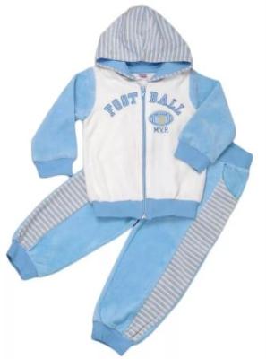 Нарядный велюровый комплект из куртки и брюк для малышей в возрасте от 1 до 4 лет. Куртка с центральной застежкой переда на замок "молнию", длинными рукавами на манжетах из рибаны, с капюшоном из материала в полоску на подкладке. Нижние срезы переда и спинки обработаны притачным поясом из рибаны. На груди выстрочена яркая надпись "FOOT BALL". Брюки с вставками из материала в полоску вдоль боковых швов переда и карманами в швах притачивания вставок. Пояс притачной с резинкой. Нижние срезы брюк обработаны манжетамии. Пояс и манжеты выполнены из рибаны. Материал - велюр – нежная и мягкая ткань. Она приятна к телу. Идеальный вариант детской одежды для прогулок, для подарка.Дополнительно