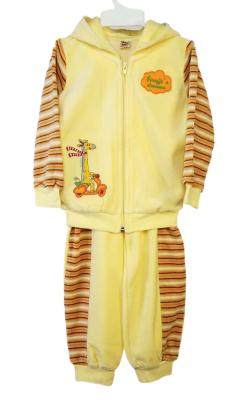Нарядный велюровый детский комплект из куртки и брюк для малышей в возрасте от 1 до 4 лет. Куртка с центральной застежкой переда на замок "молнию", длинными рукавами из материала в полоску на манжетах из рибаны, с капюшоном на подкладке. Нижние срезы переда и спинки обработаны притачным поясом из рибаны. На передней части куртки справа снизу пристрочена яркая аппликация "жираф на мопеде". Брюки с вставками из материала в полоску, вдоль боковых швов переда и карманами в швах притачивания вставок. Пояс притачной с резинкой. Нижние срезы брюк обработаны манжетами. Пояс и манжеты выполнены из рибаны. Материал - велюр – нежная и мягкая ткань. Она приятна к телу. Идеальный вариант детской одежды для прогулок, для подарка.Дополнительно