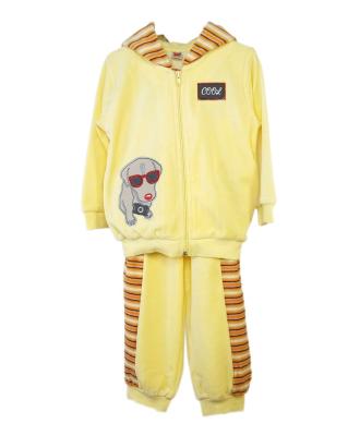 Нарядный велюровый детский комплект из куртки и брюк для малышей в возрасте от 1 до 4 лет. Куртка с центральной застежкой переда на замок "молнию", длинными рукавами на манжетах из рибаны, с капюшоном из материала в полоску на подкладке. Нижние срезы переда и спинки обработаны притачным поясом из рибаны. На передней части куртки справа снизу пристрочена яркая аппликация "собачка в очках". Брюки с вставками из материала в полоску вдоль боковых швов переда и карманами в швах притачивания вставок. Пояс притачной с резинкой. Нижние срезы брюк обработаны манжетами. Пояс и манжеты выполнены из рибаны. Материал - велюр – нежная и мягкая ткань. Она приятна к телу. Идеальный вариант детской одежды для прогулок, для подарка.Дополнительно