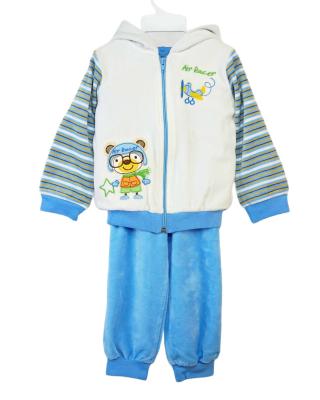 Нарядный велюровый детский комплект из куртки и брюк для малышей в возрасте от 1 до 4 лет. Куртка с центральной застежкой переда на замок "молнию", длинными рукавами из материала в полоску на манжетах из рибаны, с капюшоном на подкладке. В центре капюшона вшита вставка из материала в полоску. Нижние срезы переда и спинки обработаны притачным поясом из рибаны. На передней части куртки справа снизу пристрочена яркая аппликация "веселый пилот". Брюки с притачным поясом и манжетами из рибаны. В пояс вставлена резинка. Материал - велюр – нежная и мягкая ткань. Она приятна к телу. Идеальный вариант детской одежды для прогулок, для подарка.Дополнительно
