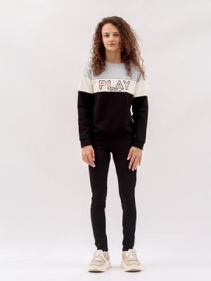 Джемпер со спущенным плечом и длинными рукавами. Горловина круглая, обработана узким воротником из полотна с эластаном. Перед и рукава джемпера с контрастными горизонтальными вставками. Рукава с эластичными манжетами по низу. Нижние срезы переда и спинки обработаны притачным поясом из полотна с эластаном. Брюки модель "лосины" из кулирки с эластаном с контрастными вставками вдоль боковых швов. Пояс на резинке.Дополнительно