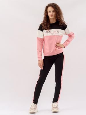 Джемпер со спущенным плечом и длинными рукавами. Горловина круглая, обработана узким воротником из полотна с эластаном. Перед и рукава джемпера с контрастными горизонтальными вставками. Рукава с эластичными манжетами по низу. Нижние срезы переда и спинки обработаны притачным поясом из полотна с эластаном. Брюки модель "лосины" из кулирки с эластаном с контрастными вставками вдоль боковых швов. Пояс на резинке.Дополнительно