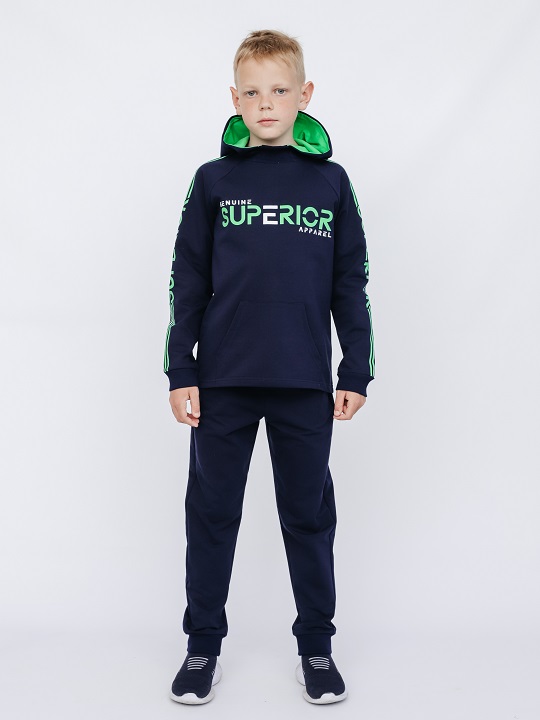 Толстовка с капюшоном и длинными рукавами "реглан". Капюшон с подкладкой и эластичной вставкой спереди. Рукава с манжетами из полотна с эластаном и принтами. Перед толстовки с карманом "кенгуру" и принтом в верхней части. Брюки с карманами в боковых швах. Пояс притачной, с резинкой и функциональным шнуром. Нижние срезы брюк обработаны притачными манжетами из полотна с эластаном.Дополнительно
