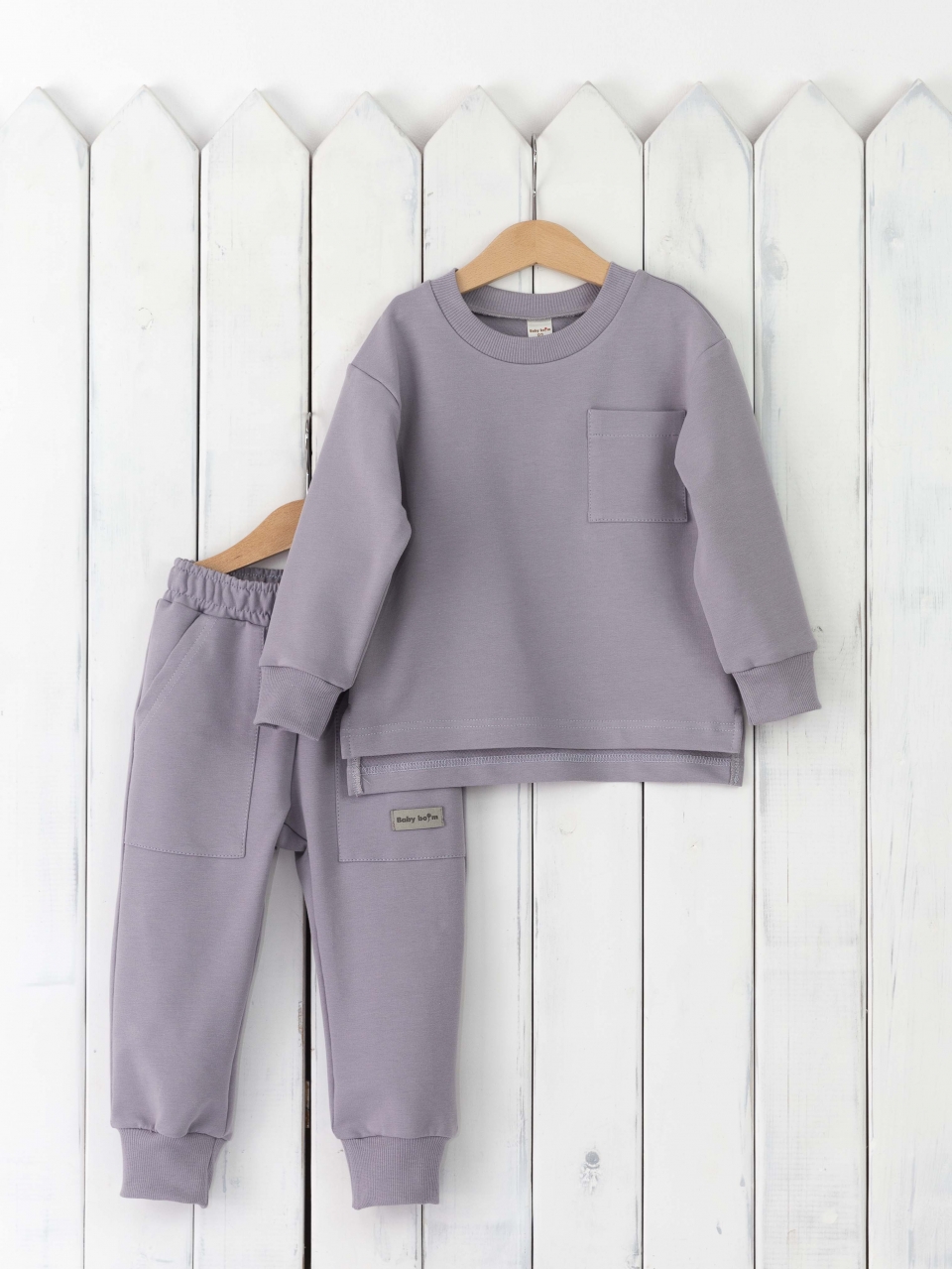 Базовый однотонный комплект из футера 2-нитки (95% хлопок, 5% эластан), состоит из джемпера с накладным карманом и небольшими разрезами по бокам, и брючек с большими накладными карманами и манжетами по низу.Дополнительно