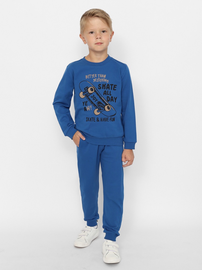 Джемпер для мальчика с длинными рукавами и притачным поясом из полотна с эластаном. Нижние срезы рукавов обработаны притачными манжетами из полотна с эластаном. Горловина круглая, обработана эластичным воротником. Перед джемпера декорирован принтом "катайся весь день". Брюки с карманами в боковых швах. Пояс и манжеты выполнены из полотна с эластаном. В пояс вставлена резинка.Дополнительно