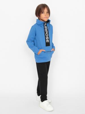 Толстовка с длинными рукавами и притачным поясом по низу. Манжеты и пояс выполнены из полотна с добавлением эластана. Перед с отрезной вставкой контрастноко цвета, которая переходит в воротник "Стойка". В нижней части переда расположен карман-кенгуру с декоративным принтом. Вставка переда декорирована принтом "ИДИ ВПЕРЕД. Брюки с притачным поясом и манжетами. В пояс вставлена резинка и функциональный шнур. Пояс и манжеты выполнены из полотна с эластаном.Дополнительно