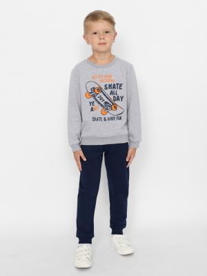 Джемпер для мальчика с длинными рукавами и притачным поясом из полотна с эластаном. Нижние срезы рукавов обработаны притачными манжетами из полотна с эластаном. Горловина круглая, обработана эластичным воротником. Перед джемпера декорирован принтом "катайся весь день". Брюки с карманами в боковых швах. Пояс и манжеты выполнены из полотна с эластаном. В пояс вставлена резинка.Дополнительно