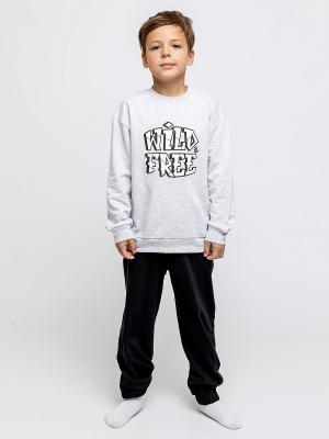 Комплект для мальчика: пуловер с длинным рукавом и брюки. Пуловер серый с надписью спереди и эластичными манжетами рукавов. Брюки черные на резинке.Дополнительно