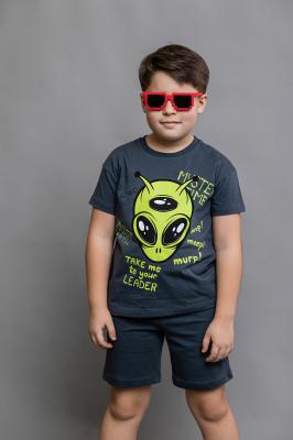 Комплект (футболка + шорты) для мальчика трикотажный из супрема пенье в цвете графит. Футболка с коротким рукавом и принтом в инопланетном стиле. Приятная на ощупь дышащая ткань комплекта не потеряет свой первоначальный вид после множества стирок.Дополнительно