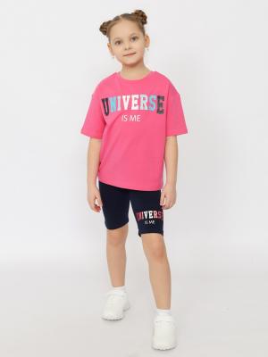 Комплект для девочки, состоящий из футболки и велосипедок, с трендовым колледж-принтом с блестящим эффеком из мягкого трикотажа. Футболка свободного кроя oversize, круглый вырез горловины, короткие рукава со спущенной линией плеча. Велосипедки без боковых швов, с резинкой по талии.Дополнительно