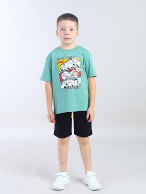 Комплект для мальчика (футболка, шорты) из мягкого трикотажа. Футболка свободного силуэта из трикотажа в полоску, горловина круглая, оформлена кашкорсе. На полочке выполнена шелкография - игровая приставка. Шорты из трикотажа, пояс на резинке. Кулиска с контрастным шнурком.Дополнительно