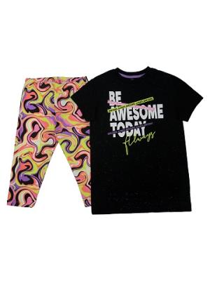 Туника для девочки с ассиметричным низом. Перед короче спинки на 6 см. Боковые швы туники со смещением на перед. Туника со спущенным плечом и коротким рукавом. Горловина круглая, обработана притачным воротником из полотна с эластаном. Перед туники декорирован принтом. Бриджи без боковых швов с резинкой по талии.Дополнительно