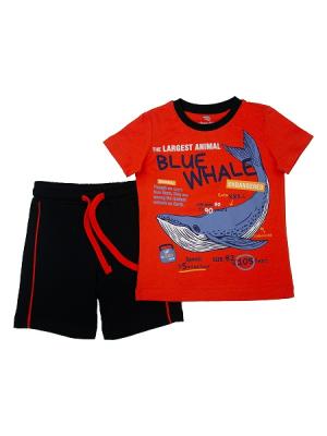 Футболка для мальчика с короткими рукавами и принтом спереди. Горловина круглая, обработана контрастным воротником из полотна с эластаном. Шорты без карманов, с кантами в боковых швах из полотна контрастного цвета. Пояс притачной с резинкой и функциональным шнуром.Дополнительно