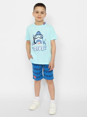 Футболка для мальчика из кулирной глади. Горловина обработана притачной бейкой из рибаны с эластаном со вставкой контрастного цвета и принтом. Перед декорирован принтом "Ныряй". Шорты для мальчика из кулирной глади повышенной плотности. Верх шорт обработан притачным поясом контрастного цвета из полотна с эластаном и функциональным шнуром. На передних половинках расположен карман. Низ шорт декорирован нашивкой.Дополнительно
