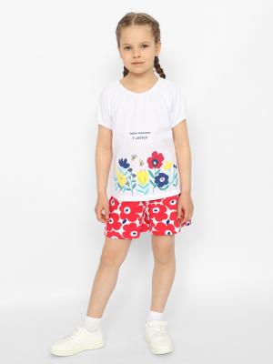 Комплект для девочки - футболка и шорты. Футболка с рукавами-реглан, с резинкой по низу рукавов и горловине. Спереди декоративный принт-панно с блестящим эффектом. Шорты для девочки из набивного хлопка, по талии на резинке, с декоративной нашивной этикеткой.Дополнительно