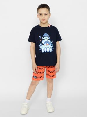 Футболка для мальчика из кулирной глади. Горловина обработана притачной бейкой из рибаны с эластаном со вставкой контрастного цвета и принтом. Перед декорирован принтом "Ныряй". Шорты для мальчика из кулирной глади повышенной плотности. Верх шорт обработан притачным поясом контрастного цвета из полотна с эластаном и функциональным шнуром. На передних половинках расположен карман. Низ шорт декорирован нашивкой.Дополнительно