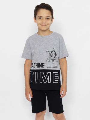 Комбинированная футболка с короткими рукавами. Горловина круглая, обработана узким воротником из полотна с эластаном. Перед футболки с горизонтальным швом чуть ниже линии груди. Перед футболки декорирован принтом "время машин". Шорты с боковыми карманами. Пояс притачной, с резинкой внутри и шнуром.Дополнительно