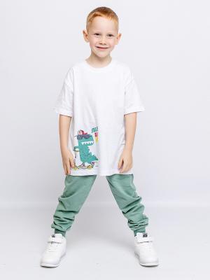 Комплект трикотажный детский: футболка с коротким рукавом и брюки. Футболка белая кроя оверсайз с динозавром. Брюки спортивные на резинке по низу. Комплект одежды для мальчика подойдет как для домашней носки, так и для улицы.Дополнительно