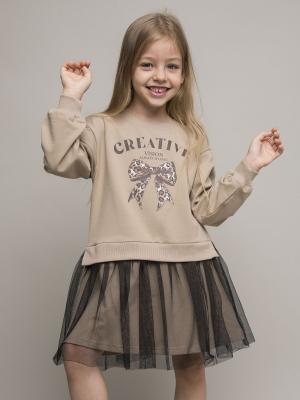 Детское платье из футера с эффектной многослойной юбкой. Очаровательное платье для девочки, выполненное из мягкого бежевого футера с длинными рукавами. Роскошная юбка из воздушной сетки создает нежный многослойный силуэт, а стильный принт на груди добавляет образу индивидуальности. Теплый футер с длинными рукавами для прохладного сезона. Пышная многослойная юбка из легкой сетки, удобная округлая горловина. Эластичные манжеты для комфортной посадки. Подходит для праздников и повседневной носки.Дополнительно