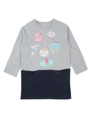 Платье комбинированное из двух цветов гладкокрашенного футера без начёса, с длинными рукавами-реглан. Горловина круглая. По низу рукава широкий манжет из основного полотна. Воротник выполнен из полотна с эластаном. По низу широкая подгибка. Перед декорирован принтомДополнительно