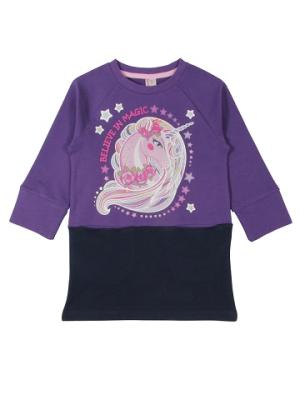 Платье комбинированное из двух цветов гладкокрашенного футера без начёса, с длинными рукавами-реглан. Горловина круглая. По низу рукава широкий манжет из основного полотна. Воротник выполнен из полотна с эластаном. По низу широкая подгибка. Перед декорирован принтомДополнительно