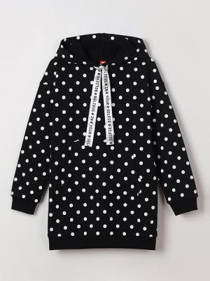 Платье для девочки со спущенным плечом, с длинными рукавами и капюшоном. Спереди карман-кенгуру. Манжеты и пояс выполнены из эластичного полотна. В шов подгибки по краю капюшона вставлен принтованный шнур из атласной ленты. С левой стороны переда - небольшой принт.Дополнительно