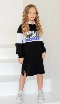 Платье с длинным рукавом для девочки из футера. Отложный воротник, надпись на груди, черно-белая расцветка.Дополнительно
