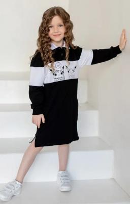 Платье с длинным рукавом для девочки из футера. Свободный крой, черно-белая расцветка, рисунок на груди.Дополнительно