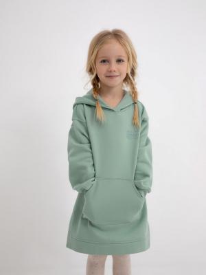 Платье-толстовка светло-зеленого цвета для девочек выполнено из смесового хлопкового футера. Износоустойчивый, дышащий и гипоаллергенный материал, за которым легко ухаживать. Приятная к телу изнанка с начесом. Свободный крой. Капюшон на трикотажной подкладке, длинные рукава с манжетами на резинке. Карман-муфта. Небольшие боковые разрезы. Объемный текстовый принт: Следуй своему пути.Дополнительно