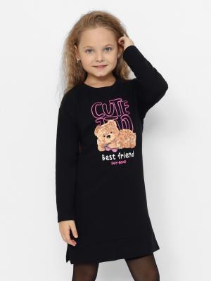 Детское платье из футера свободного силуэта отлично подойдет для повседневных образов. Свободный силуэт с заниженной линией плеча не сковывает движения. Круглый вырез горловины оформлен воротником из полотна с эластаном. Перед декорирован ярким трендовым принтом (надпись: "Милый. Лучший друг. Игрушечный медведь").Дополнительно