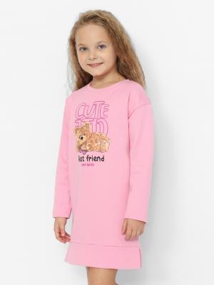Детское платье из футера свободного силуэта отлично подойдет для повседневных образов. Свободный силуэт с заниженной линией плеча не сковывает движения. Круглый вырез горловины оформлен воротником из полотна с эластаном. Перед декорирован ярким трендовым принтом (надпись: "Милый. Лучший друг. Игрушечный медведь").Дополнительно