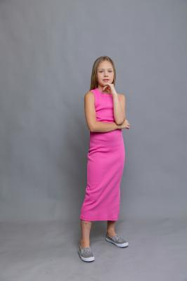 Платье с коротким рукавом для девочки в цвете фуксия длинное. Выполнено из эластичного материала - кашкорсе, произведенного из эластичного натурального хлопка. Длинная модель без рукавов в однотонной расцветке имеет прямой крой и разрез сбоку в нижней части.Дополнительно