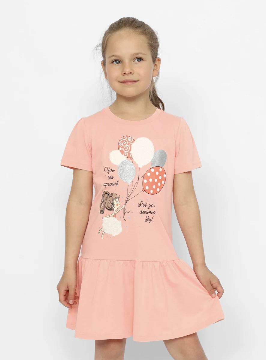 Платье для девочки отрезное по линии ниже талии. Юбка со сборкой по шву притачивания. Рукава короткие, со сборкой по окату. Горловина обработана узким воротником из полотна с эластаном. Перед платья декорирован принтом c объемной вышивкой "suzine" "Пусть летят твои мечты".Дополнительно