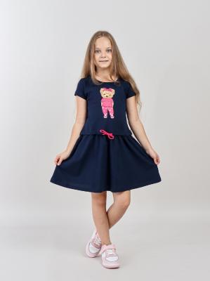 Платье для девочки из мягкого трикотажа. На кокетке выполнена шелкография в виде девочки-мишки. Горловина круглая, оформлена кашкорсе. Рукав фонарик. Отрезная часть платья на кулиске с контрастным шнурком.Дополнительно