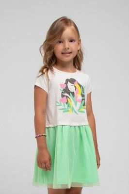 Нарядное летнее платье светло-бежевого оттенка с пышной юбочкой и короткими рукавами. Верхний слой юбки - из сетки с золотыми блёстками. Для удобства одевания застёгивается на спинке на кнопки. Украшено принтом с девочкой и птицей какаду.Дополнительно