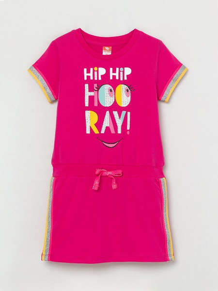 Платье для девочки с поясом из эластичного полотна. В пояс для дополнительной регулировки вставлен шнур контрастного цвета. Рукава короткие, декорированы настроченной на край контрастной лентой. Кроме этого контрастная лента настрочена на боковые швы юбки. Перед платья декорирован принтом.Дополнительно