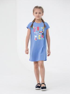 Платье для девочки "А" образного силуэта с короткими рукавами и, скругленным к боковым швам, низом. Перед платья декорирован принтом.Дополнительно