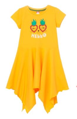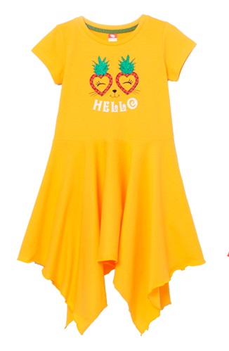 Платье для девочки с короткими рукавами и отрезной юбкой. Рукава втачные. Юбка с провисающими углами. Перед платья декорирован принтом.Дополнительно