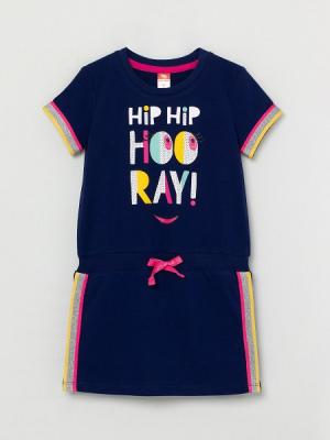 Платье для девочки с поясом из эластичного полотна. В пояс для дополнительной регулировки вставлен шнур контрастного цвета. Рукава короткие, декорированы настроченной на край контрастной лентой. Кроме этого контрастная лента настрочена на боковые швы юбки. Перед платья декорирован принтом.Дополнительно