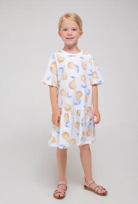 Лёгкое отрезное платье с короткими рукавами. Сшито из набивного трикотажа супрем с изображением груш. Спущенные плечи придают свободный объём. На талии сборка. Рукава и низ обработаны плоскими швами.Дополнительно