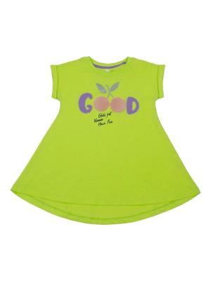 Платье для девочки "А"-образного силуэта с дополнительным расклешением к низу. Спущенное плечо переходит в рукав. Перед платья декорирован принтом с объемной вышикой "сюзине". Платье с несимметричным низом, перед короче спинки на 4 см.Дополнительно