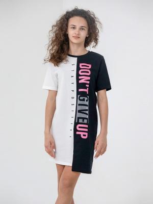 Платье для девочки с короткими рукавами. Перед и спинка платья с вертикальным швом по центру, состоят из двух деталей контрастного цвета и разной длины. Левая часть платья на 3 см длиннее правой. Обе части переда декорированы принтом.Дополнительно
