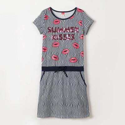 Платье для девочки с короткими рукавами и эластичным поясом. Горловина круглая, обработана воротником из полотна с эластаном. На юбке обработаны боковые карманы. Перед платья декорирован принтом с использованием красок с блеском.Дополнительно