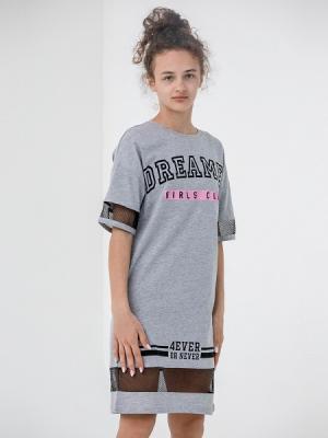 Платье для девочки прямое, со спущенным плечом. Рукава короткие. Горловина обработана притачным воротником из полотна с эластаном. По низу платья, а также по низу рукавов вставки из сетки. Перед платья декорирован принтом.Дополнительно