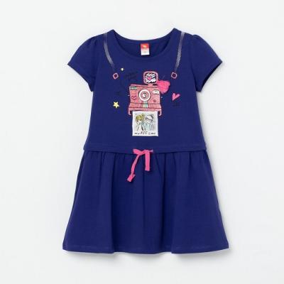 Платье для девочки с короткими рукавами и кулиской на талии. Рукава втачные, со сборкой по окату. В кулиску вставлен шнур. Юбка со сборкой по шву притачивания. Перед платья декорирован принтом.Дополнительно