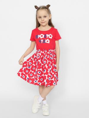 Комбинированное платье для девочки из гладкокрашенного и набивного хлопка, отрезное по талии с короткими рукавами. Юбка со сборкой. Горловина обработана окантовочной бейкой из кулирки. Перед декорирован принтом.Дополнительно