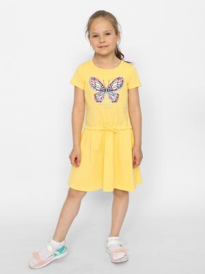 Платье для девочки с отрезной юбкой и кулиской со шнуром по шву притачивания юбки. Рукава короткие, со сборкой по окату. Горловина круглая, окантована бейкой из основного полотна. Перед платья декорирован принтом с вышивкой пайетками.Дополнительно