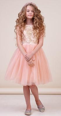 Однотонное платье в персиковом цвете с многослойной фатиновой юбкой, расшитое золотыми пайетками. Изящный узор из пайеток выделяет модель среди других платьев. Платье хорошо облегает фигуру, а в сочетании с объемной юбкой создается утонченный, элегантный силуэт. Завершает образ красивая спинка с v-образным вырезом. Приятный материал на хлопковой (!) подкладке. Это платье отлично подходит для выпускного из детского сада, новогодних и других праздников.Дополнительно